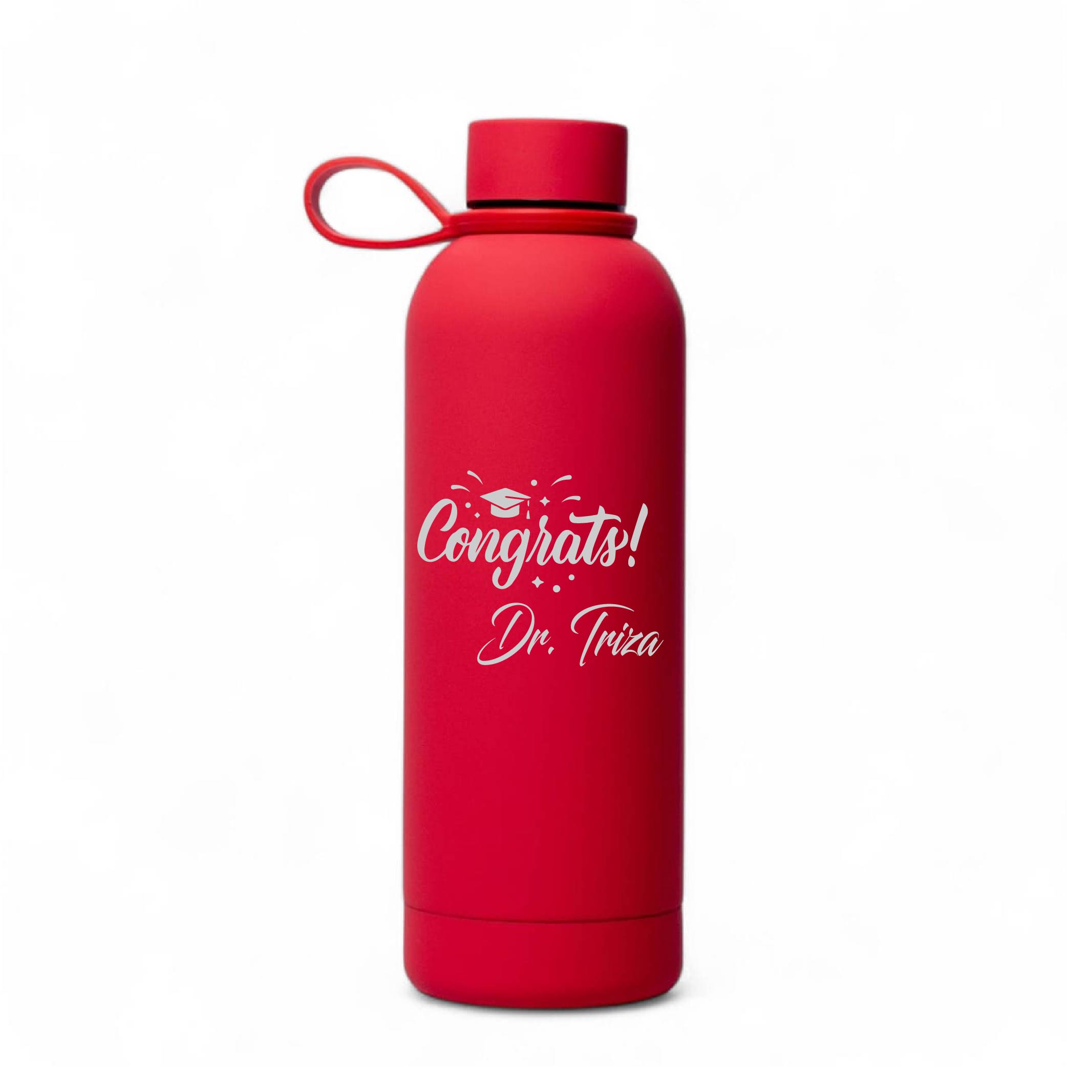 About this: Branded Red Thermal Flask Celebrate a monumental achievement with this custom Skin Feel Thermal Flask, the perfect personalized gift for a new Doctor! This vibrant red bottle features a soft, matte, 'skin feel' finish that is comfortable to hold and provides a non-slip grip. Engraved with the congratulatory message 'Congrats! Dr. [Name]' and a graduation cap motif, it's a memorable keepsake for any medical, PhD, or professional doctorate graduate. Crafted from premium double-walled stainless steel, this insulated flask keeps drinks cold for up to 24 hours and hot for up to 12 hours. The sleek, durable design includes a secure screw-top lid and a convenient carry loop, making it an essential companion for the hospital, office, or university. Key Features: