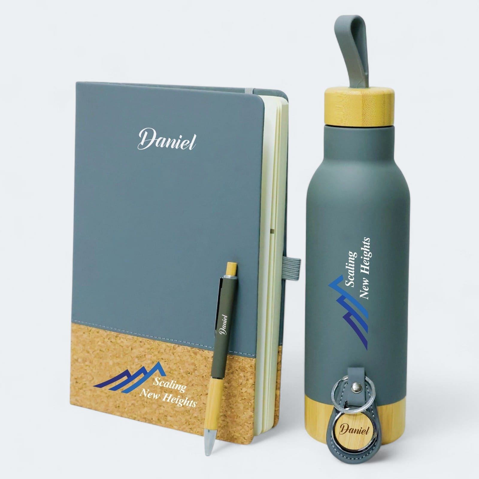 Crafted with a modern aesthetic, the set features a stylish notebook with a cork accent, a durable bottle with a secure lid, and sleek accessories that can be personalized with names, logos, or messages. Ideal for corporate gifting, branding, onboarding kits, or special occasions.