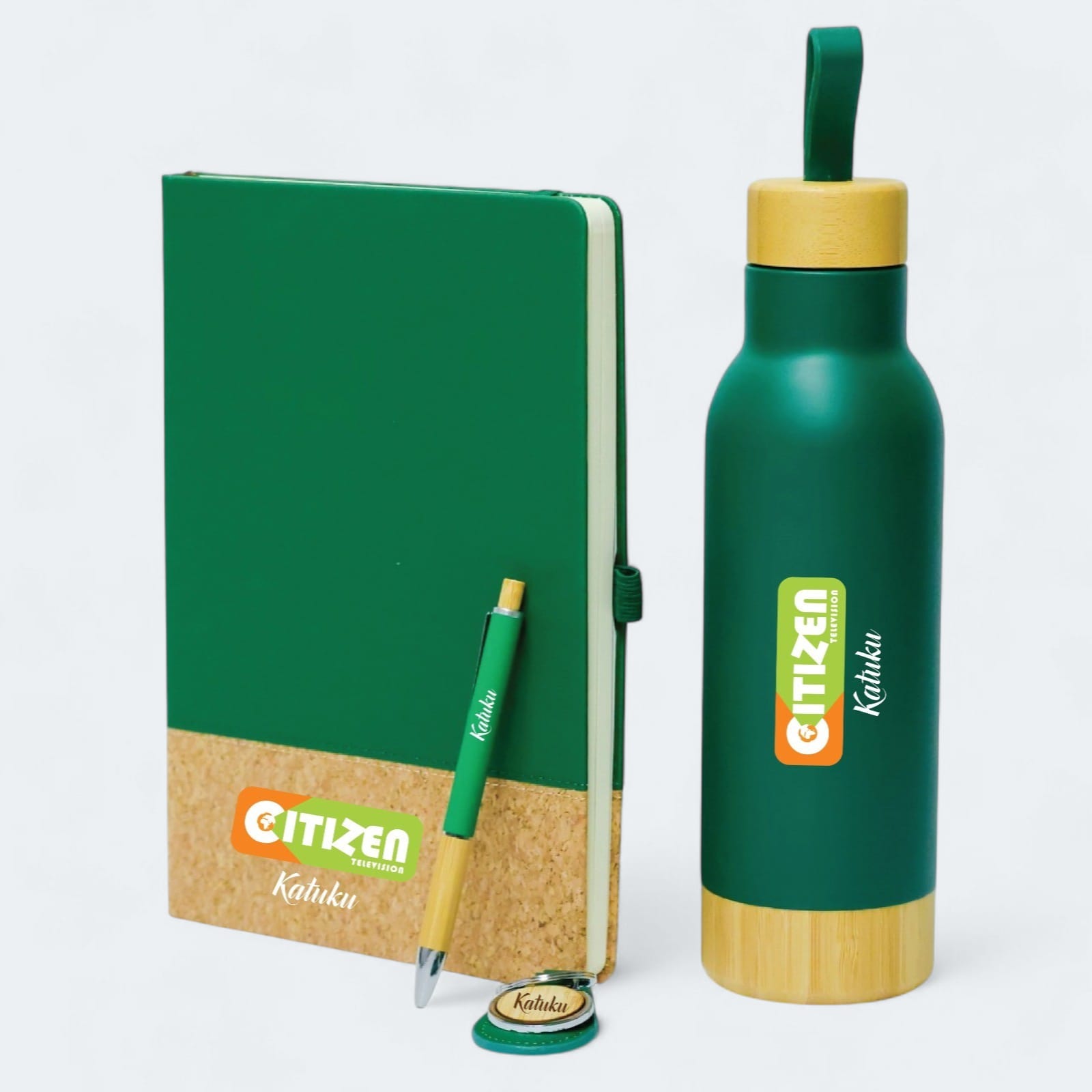 Upgrade your gifting game with this elegant Executive 4-in-1 Gift Set, designed for professionals, clients, and special occasions. This premium combo includes a stylish hardcover notebook, a sleek insulated water bottle, a matching pen, and a keychain—all beautifully coordinated with a modern green and natural wood finish.