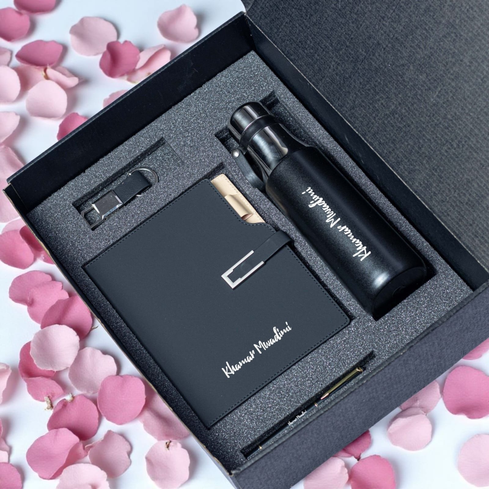 • Insulated Black Water Bottle: A modern, matte-black metal bottle, ideal for keeping drinks hot or cold. It’s also personalized to match the notebook, adding a high-end, cohesive feel.
