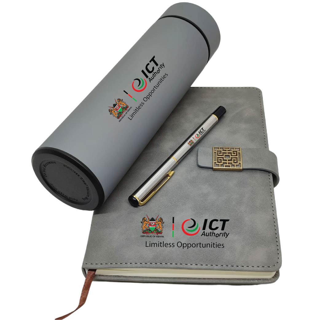 - Complete Executive Set: Includes three essential desk and travel items: a Grey A5 Notebook, a matching Thermal Flask, and a high-quality Branded Pen.