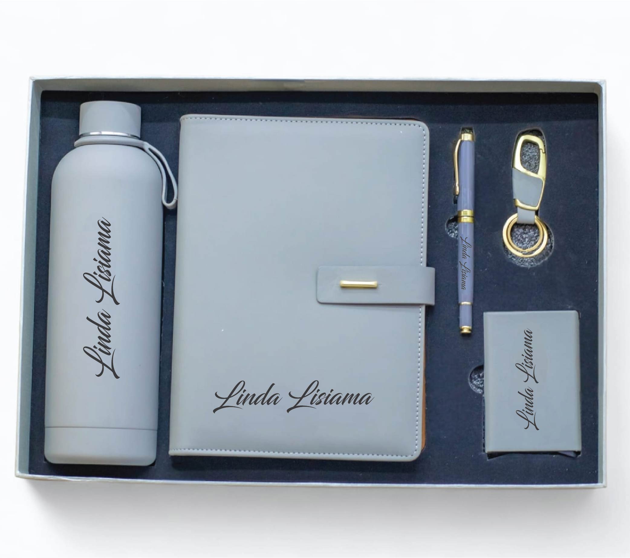 The set includes a personalized A5 notebook with magnetic strap, a matching insulated water bottle, a metal pen, a stylish key holder, and a coordinated card holder—all finished in elegant grey tones with custom name or logo engraving. Ideal for executives, employees, clients, or graduates, this gift set reflects professionalism, appreciation, and quality.