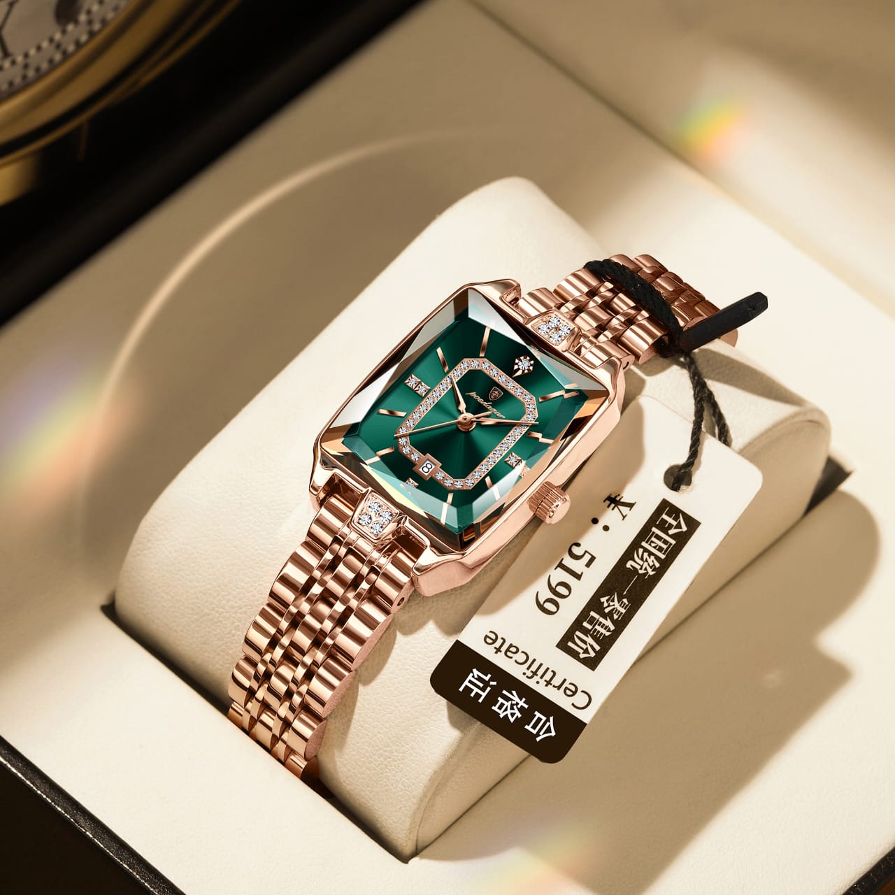 Elevate your style with the Poedagar Ladies Watch, a perfect combination of luxury, elegance, and precision, exclusively available at Rio Gift Shop. Designed for women who appreciate premium craftsmanship and modern beauty, this stunning wristwatch features a faceted emerald-green crystal dial framed by a rose-gold stainless steel case that radiates sophistication and charm.