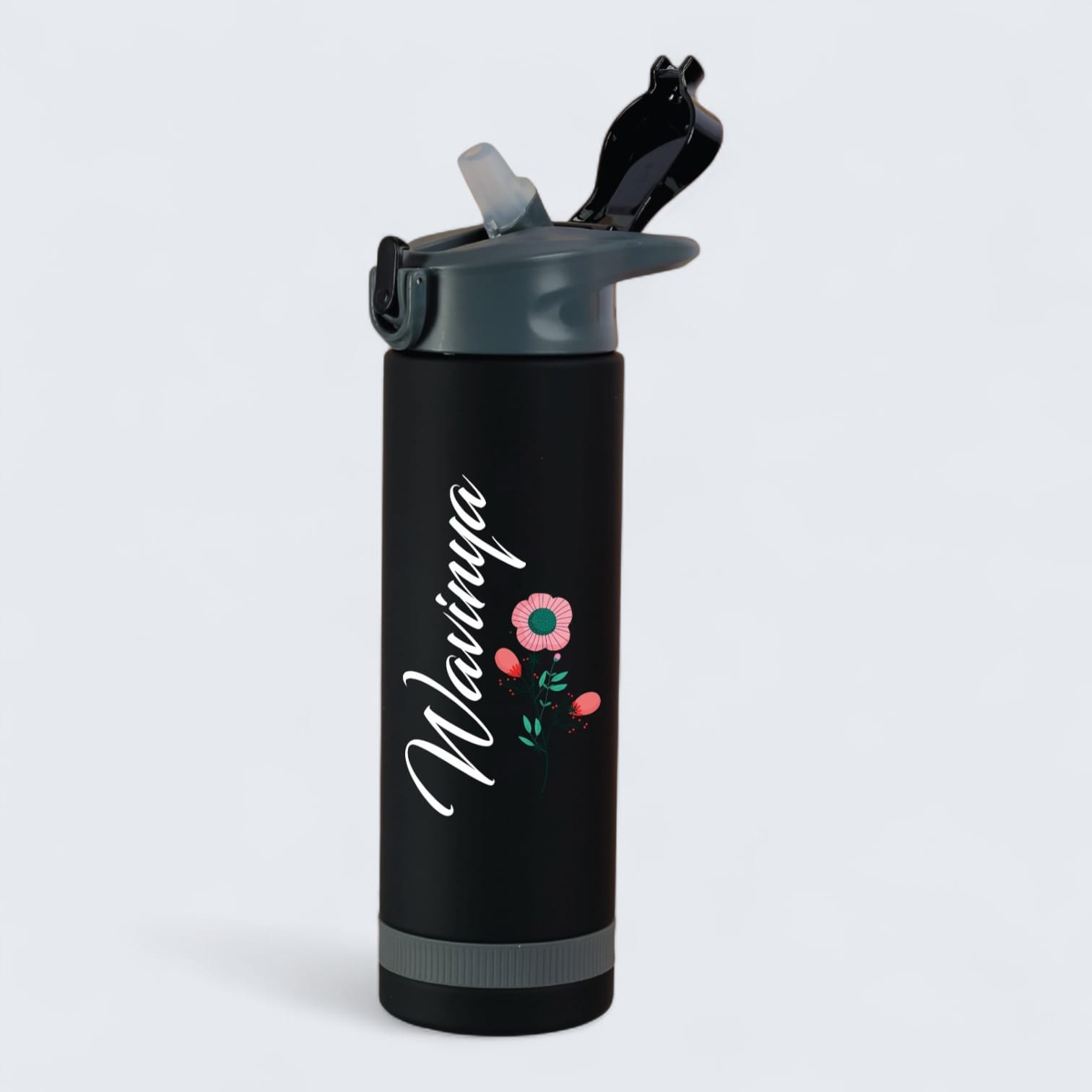 The flip-top straw lid allows easy one-hand drinking while preventing spills, making it ideal for active lifestyles. Featuring a custom name print with a floral design, it adds a personal touch—perfect as a gift or for personal use.