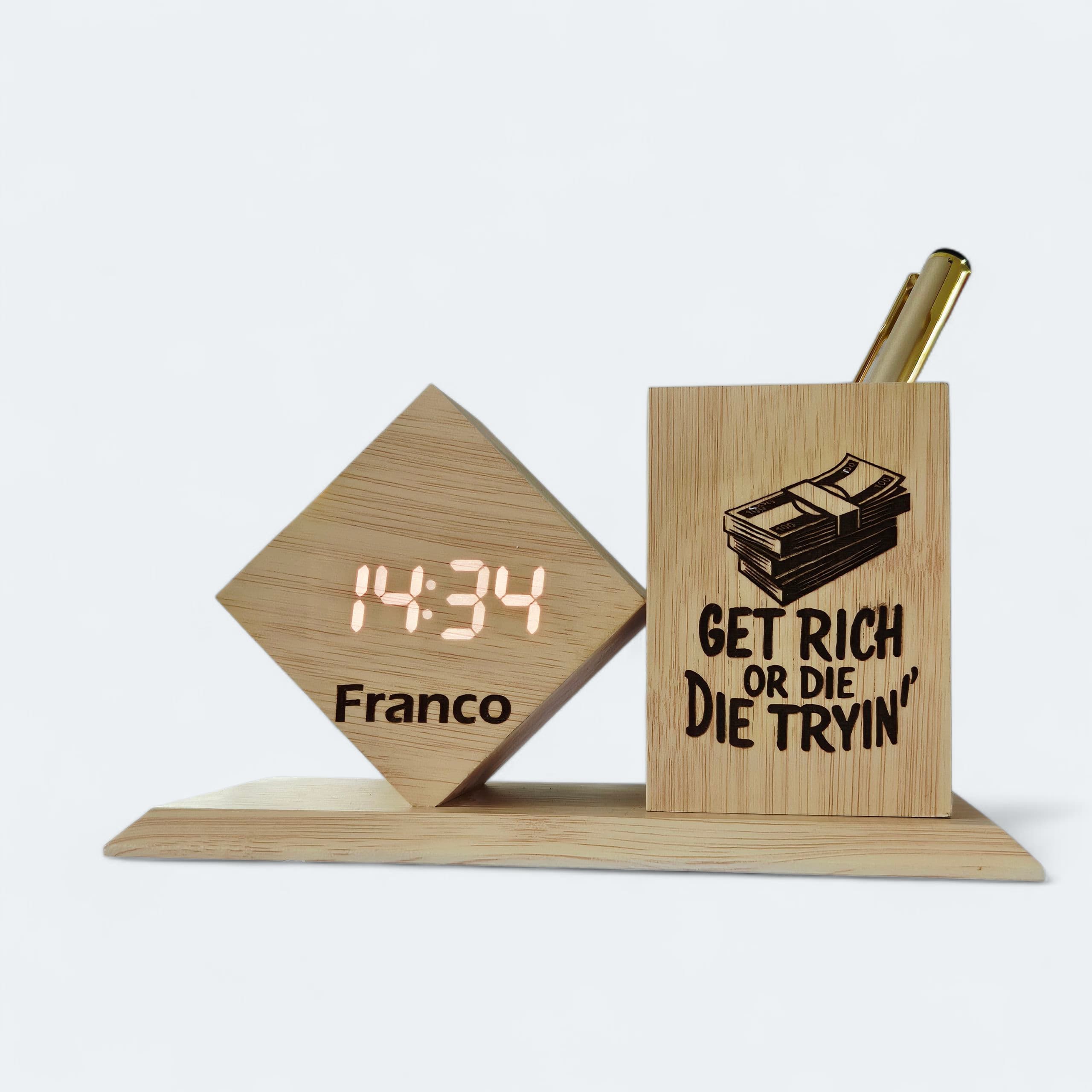 The engraved quote “GET RICH OR DIE TRYIN’” adds a bold, motivational touch, making it a perfect piece for entrepreneurs, professionals, or anyone driven by ambition. The custom name engraving option (like “Franco”) makes it even more special — an ideal gift for birthdays, corporate events, or home offices.