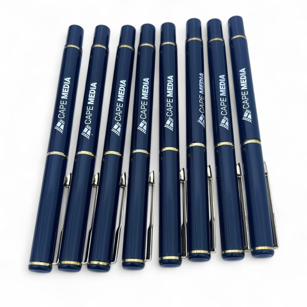 Each pen comes customized with your company logo (as shown with CAPE MEDIA), making them perfect for corporate gifting, conferences, brand promotions, employee kits, and client appreciation. The pens write effortlessly with clean, consistent ink flow—ideal for everyday office use or professional presentations.
