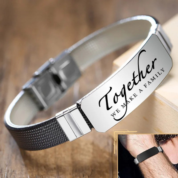 This stylish bracelet is the perfect blend of modern design and personal sentiment. It features a durable, comfortable band that contrasts with a polished metallic bar, creating a bold and minimalist look. The metal bar can be custom-engraved with a special message, name, or date, making this bracelet a deeply meaningful and one-of-a-kind accessory.