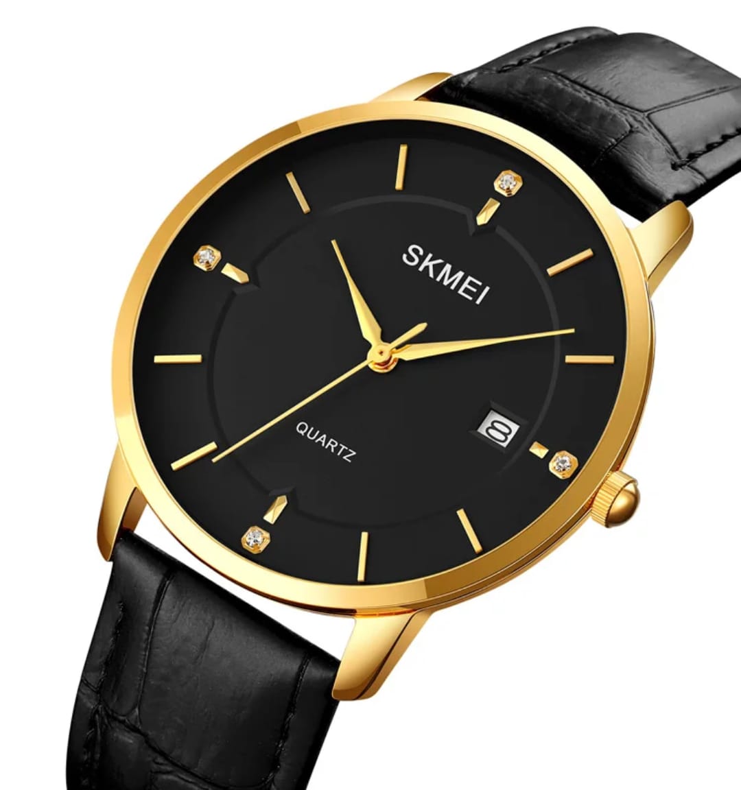 Elevate your style with the SKMEI Men’s Quartz Leather Wrist Watch, crafted for modern gentlemen who value elegance and functionality. Featuring a sleek black dial with golden accents, genuine leather strap, and a durable stainless steel case, this timepiece combines sophistication with everyday practicality.