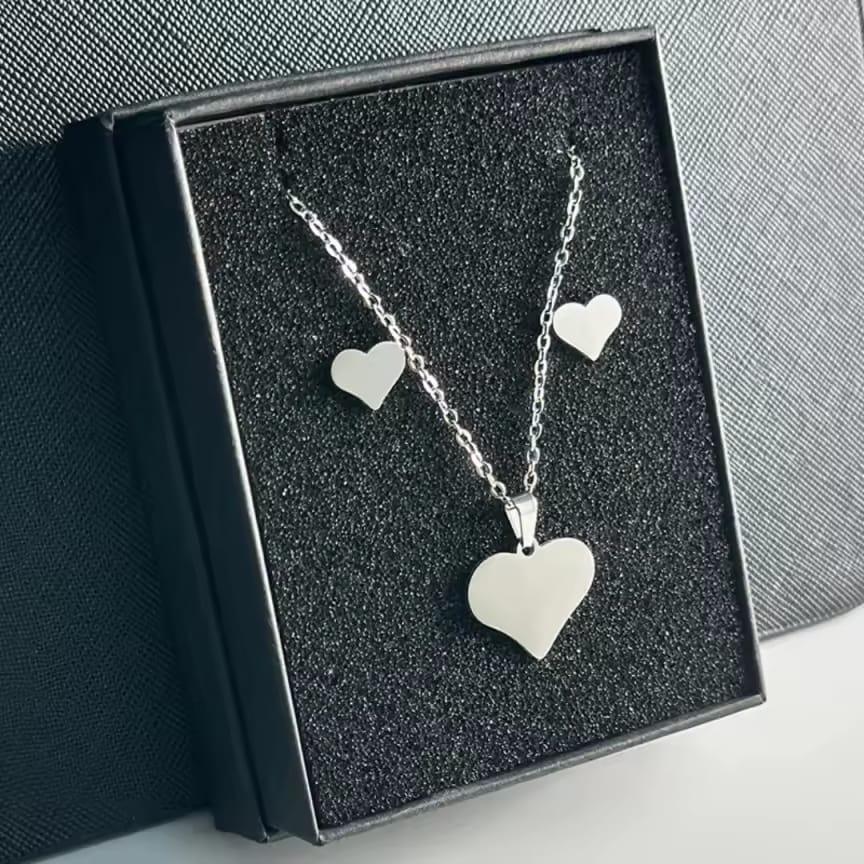 Add a touch of timeless elegance to your style with this Silver Stainless Steel Heart Pendant Necklace & Earrings Set. Designed with a sleek and modern finish, this matching set features a beautifully polished heart pendant paired with stylish heart-shaped stud earrings—perfect for everyday wear or special occasions.