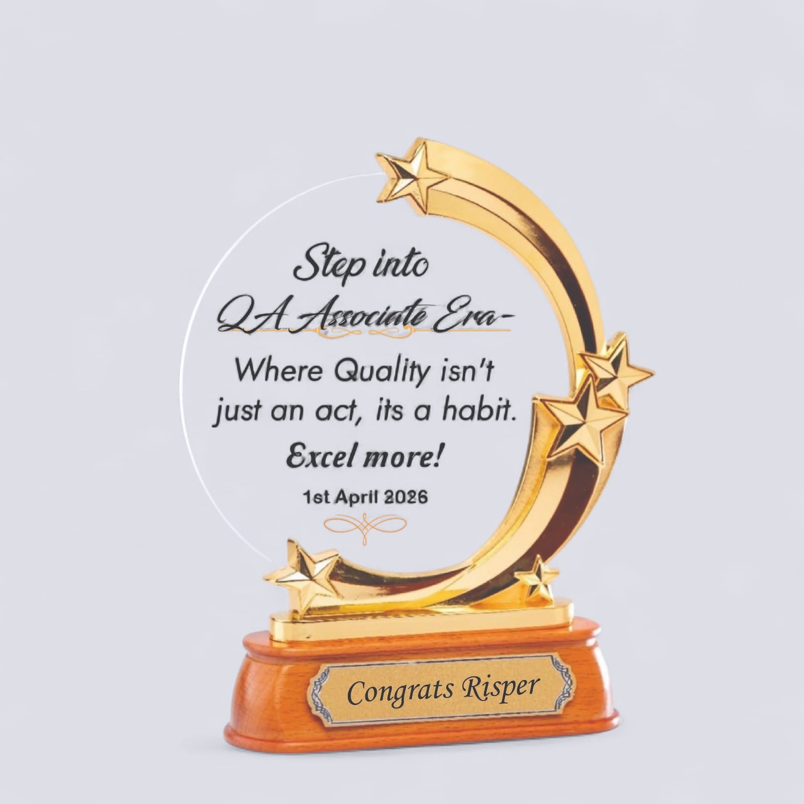 Celebrate excellence in style with this beautifully crafted award trophy featuring a polished wooden base and a gold star crescent design. The clear circular acrylic plaque provides the perfect space for personalized messages, making it ideal for corporate recognition, school awards, or special celebrations.